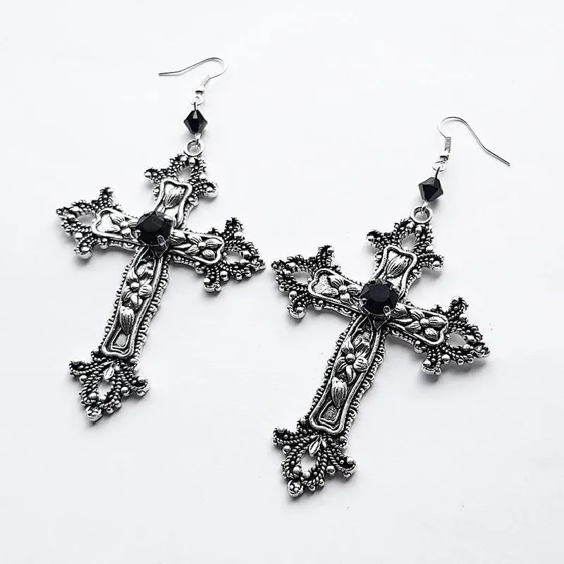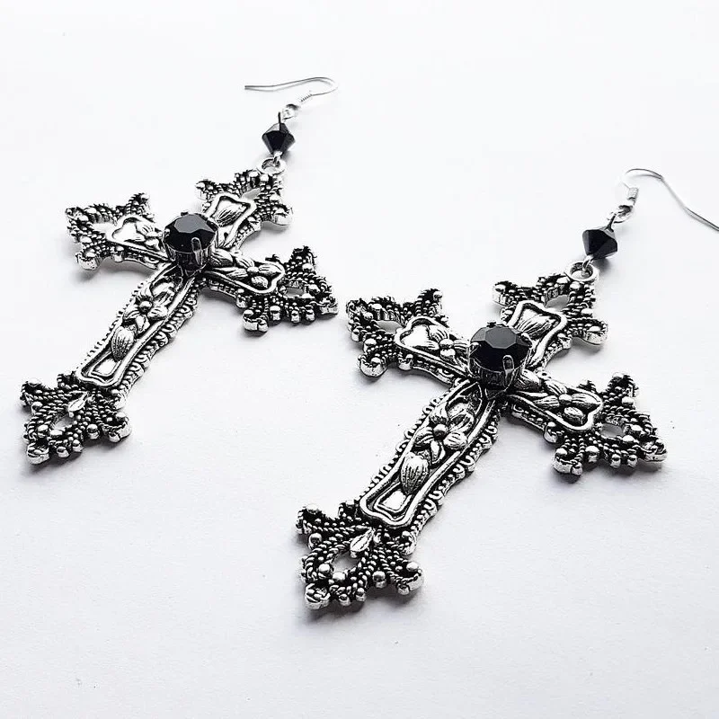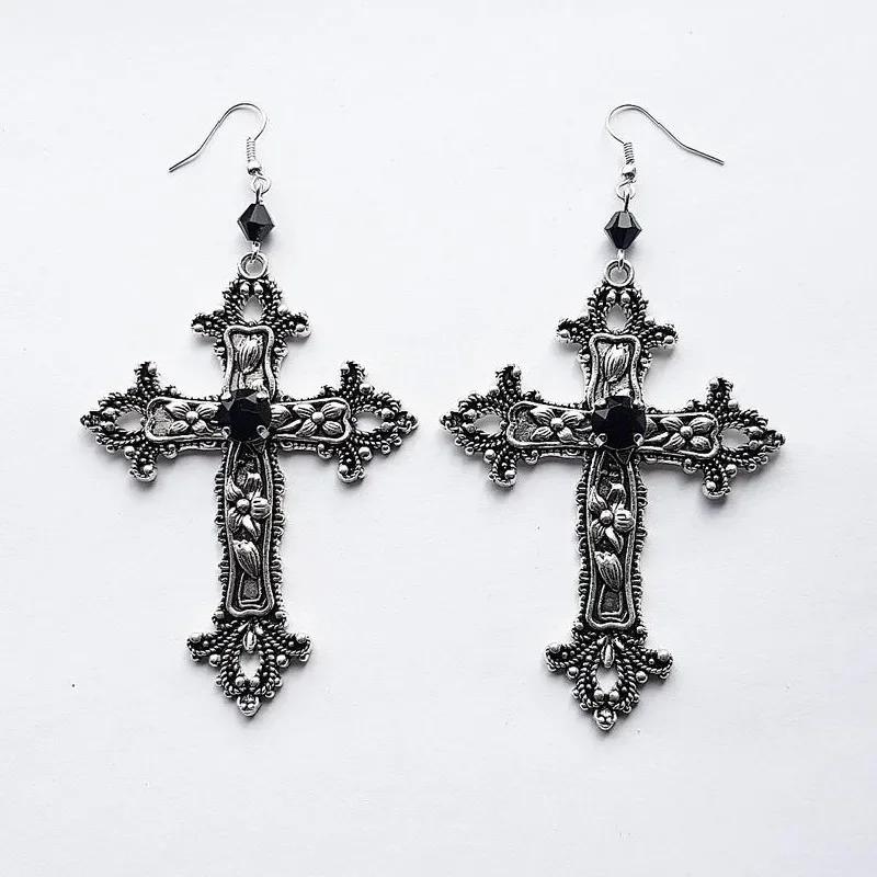 Goth Large Detailed Cross Black Drill Jewel Earrings Silver Color Gothic Punk Jewellery Fashion Gorgeous Statement Women Gift